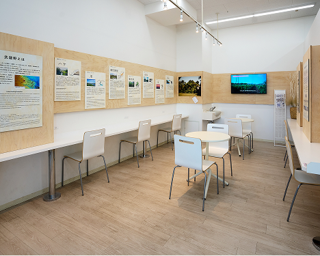 武蔵野を知る入口として名付けられたコミュニティスペースです。武蔵野図屏風に着想を得たデザインで、国産木材を用い、草原から雑木林へと変わる武蔵野台地の風景を表現。ファミリーマート利用者の憩いの場として、地域文化に触れられるワークショップや企画展示なども実施し、地域と来訪者をつなぐ場として開かれています。