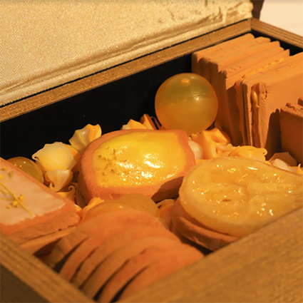 SNSを活用する女子大学生をメインターゲットに設定し、『檸檬』の世界観を感じさせるスイーツボックスを企画して実際に食品サンプルを制作。中身のお菓子のリアルな質感や見栄え、装飾の施されたブック型のパッケージなど、全てにこだわりを持って制作されています。