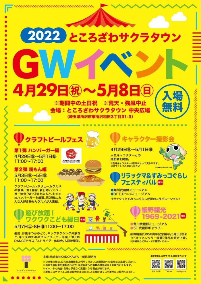 4月29日(祝)~5月8日(日) のゴールデンウィーク期間(平日を除く)、ところざわサクラタウンでは、屋外オープンスペース「中央広場」を中心に、家族みんなで楽しめる様々なイベントを開催します。