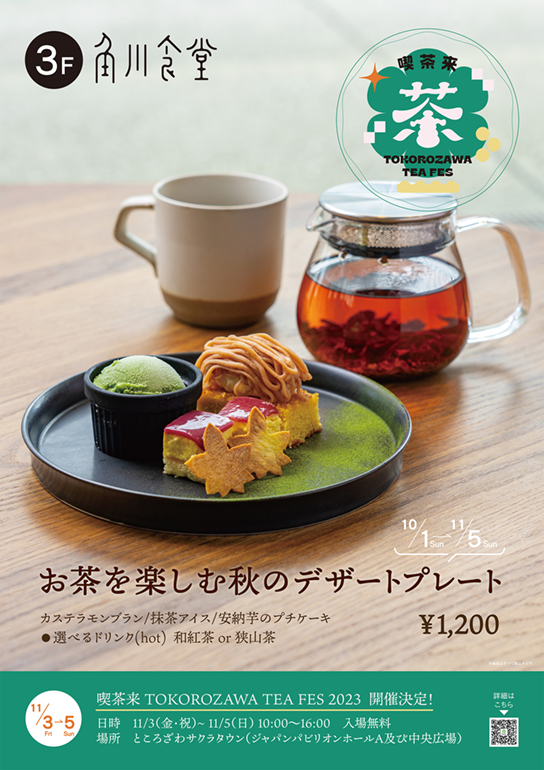 ところざわサクラタウン 3階 角川食堂では、季節のデザート&ドリンクセットを提供しています。10月からのデザートは『お茶を楽しむ秋のデザートプレート』。