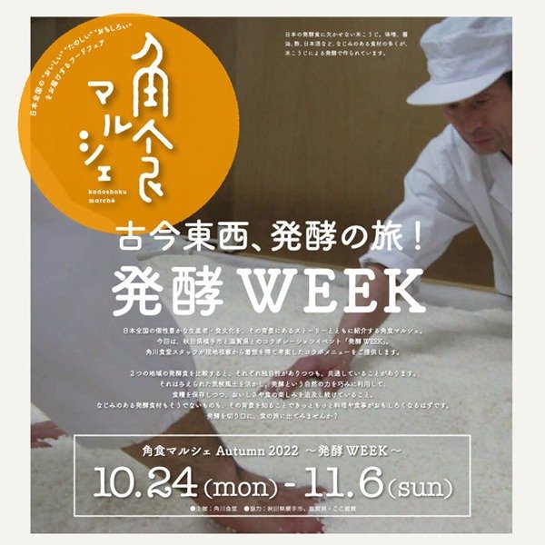 日本全国の個性豊かな生産者・食文化を、その背景にあるストーリーとともに紹介する角食マルシェ。今回は、秋田県横手市と滋賀県とのコラボレーションイベント「発酵WEEK」。角川食堂スタッフが現地視察から着想を得て考案したコラボメニューをご提供します。