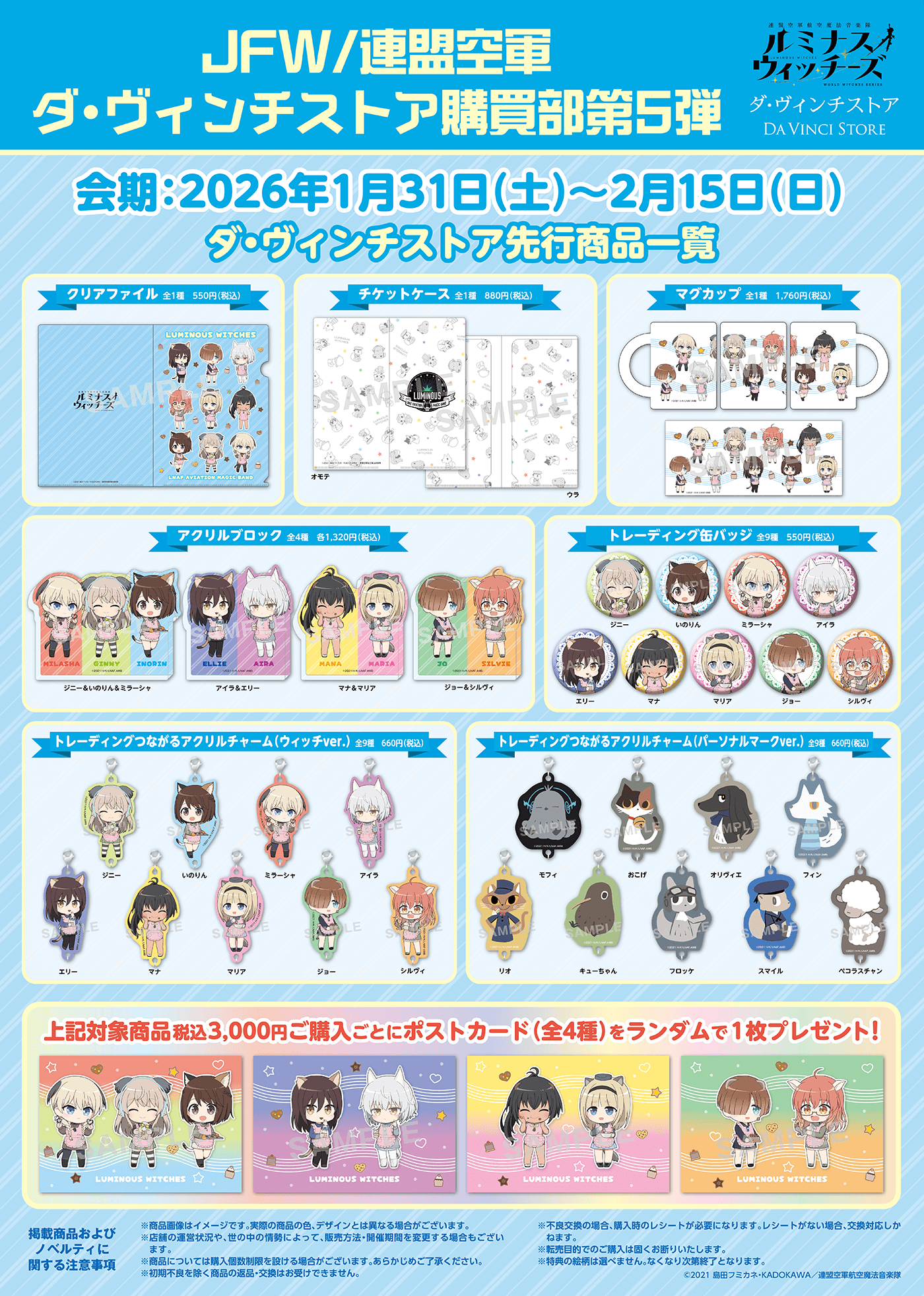 期間中「JFW/連盟空軍ダ・ヴィンチストア購買部」コーナー内の第5弾オリジナル商品をお買い上げのお客様には、税込3,000円ご購入ごとにポストカード(全4種)をランダムで1枚プレゼント!