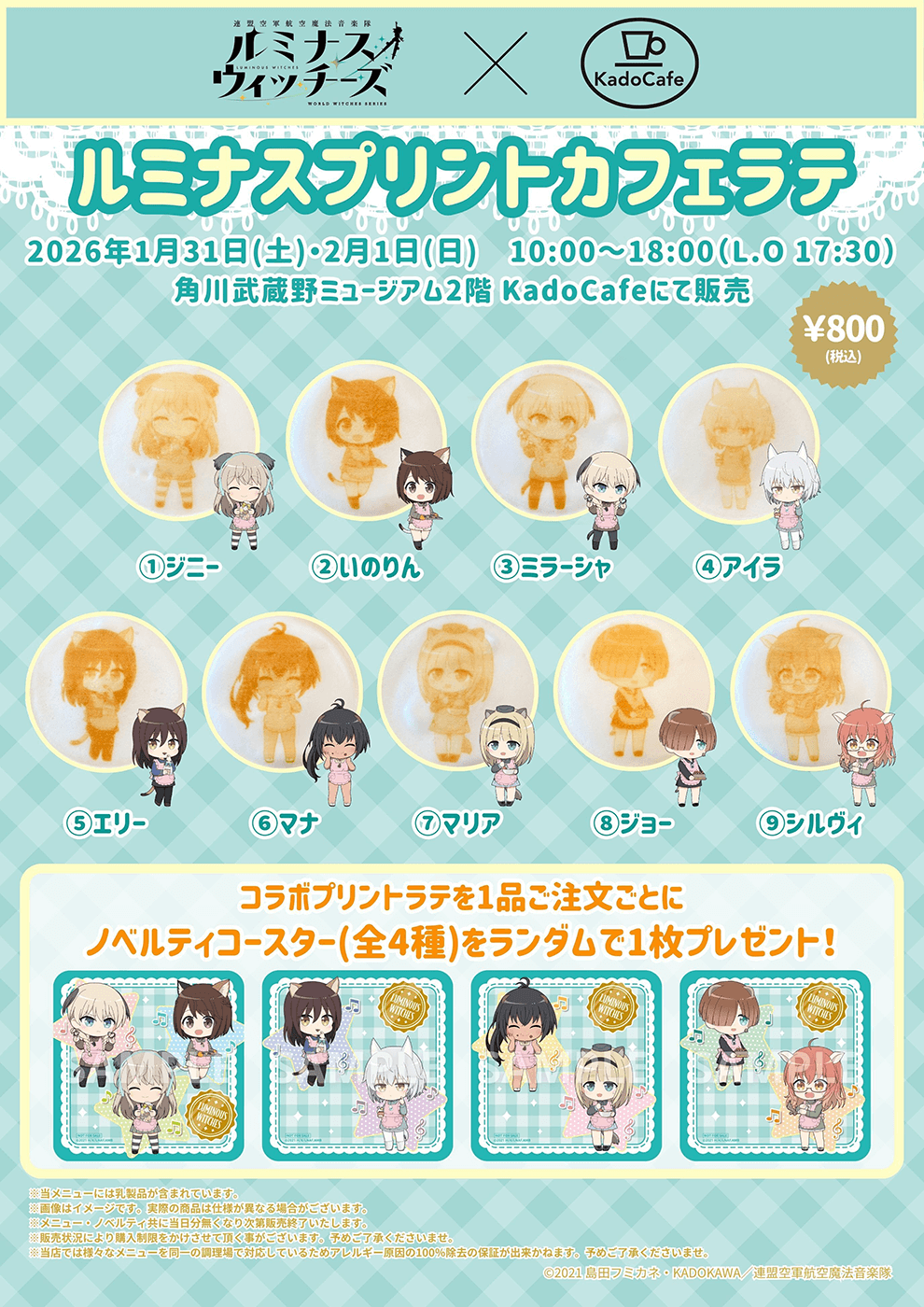 KadoCafeでは、音楽隊メンバーのイラストがプリントされたコラボプリントラテを販売!コラボプリントラテを1杯ご購入毎に、ノベルティとしてオリジナルコースター(全4種)をランダムで1枚プレゼント! 詳細は画像をご確認ください。