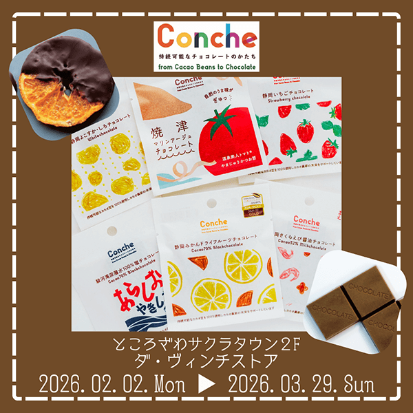 ところざわサクラタウン 2階 ダ・ヴィンチストアにて、2026年2月2日(月)~3月29日(日)の期間限定で、クラフトチョコレート専門店「Conche」のポップアップショップを開催します。