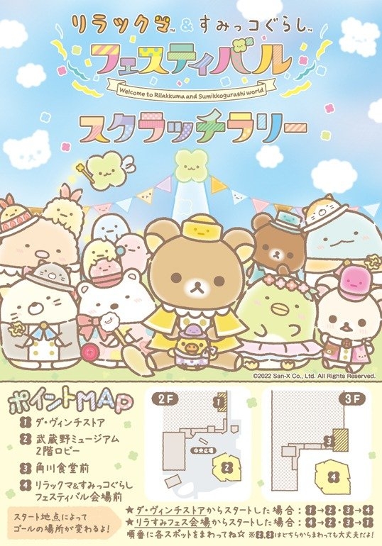 リラックマ&すみっコぐらしのことをもっと知ることができるスクラッチラリーを開催。サクラタウン内の問題がある4つのポイントをめぐって、答えが分かったらスクラッチ!