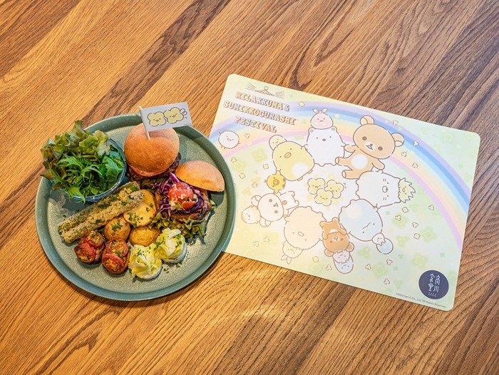 角川食堂との限定コラボメニュー「リラックマ&すみっコぐらしフェスティバル ピクニックプレート」が登場。「みんなでピクニック」をテーマにした、大人も子どもも食べやすいフィンガーフードは、大豆ミートのベジバーガーをはじめとした、からだにやさしい料理が乗っています。ランチピック&ランチョンマット付き。