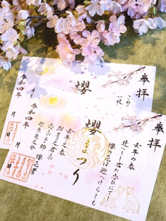 「サクラまつり2022」会期中、武蔵野坐令和神社にて、桜や和歌をあしらった期間限定の記念御朱印を頒布いたします。「朝桜」と「夜桜」の2種となります。