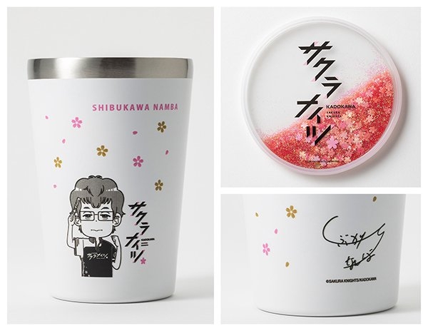新ユニフォームを着用した各選手のイラストが入ったタンブラーと、サクラナイツらしくサクラ色のグリッターがキラキラと美しいコースターのセット。各選手のタンブラーはプリントサイン付き。