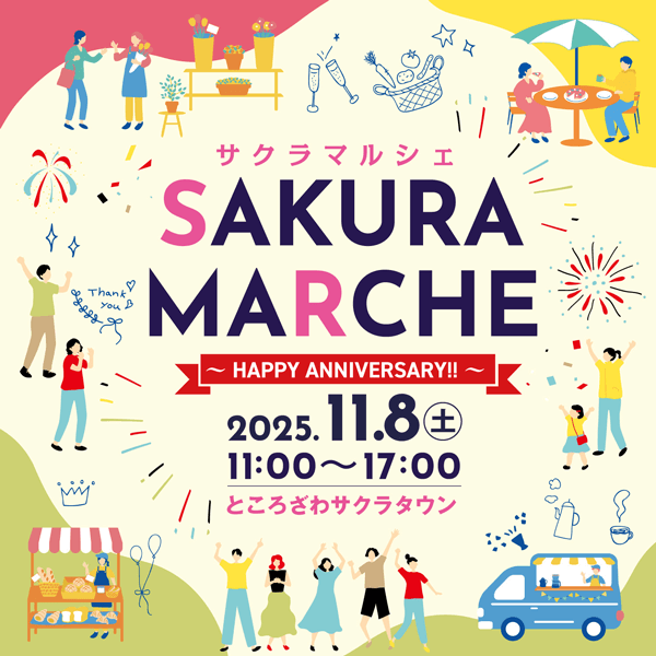 ところざわサクラタウン 中央広場にて、2025年11月8日(土)に「サクラマルシェ~HAPPY ANNIVERSARY!!~」を開催。食品や雑貨の販売はもちろん、さまざまなワークショップも実施します。