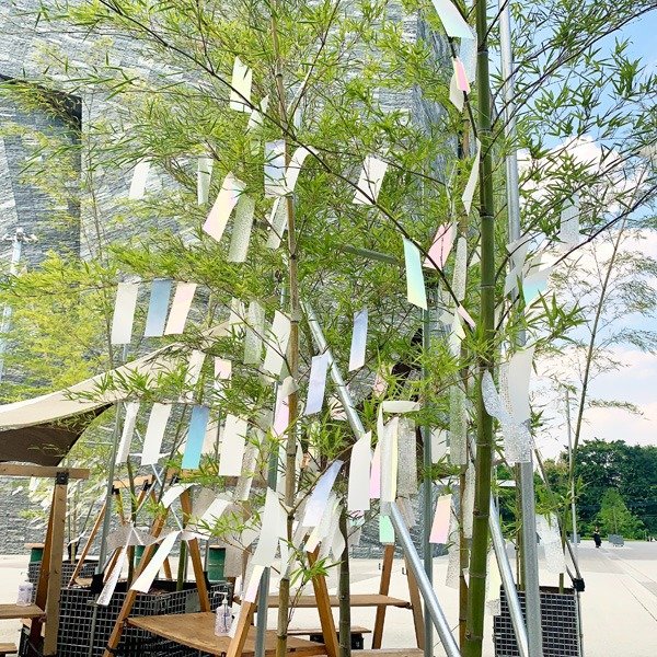 中央広場の竹に、光によって七色に変化する短冊を飾ります。見る角度を変えたり、フラッシュ撮影をすると短冊の色が変化します。スマホのカメラのフラッシュをオンにして、撮影をお楽しみください。