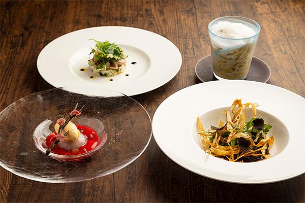 浮世絵の最盛期である江戸時代、庶民に愛されていたファストフードの「寿司」、「天ぷら」、「うなぎのかば焼き」をイタリアンの技法でSACULA DINER風にアレンジしコース仕立てにしました。