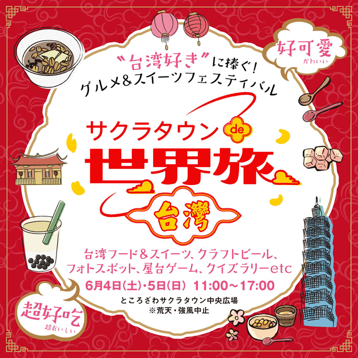 6月4日(土)、5日(日)の2日間、ところざわサクラタウン中央広場にて「サクラタウンde世界旅-台湾-」を開催します。コロナ禍で、台湾ロスとなっている"台湾好き"に向けたグルメ&スイーツフェスティバルです。