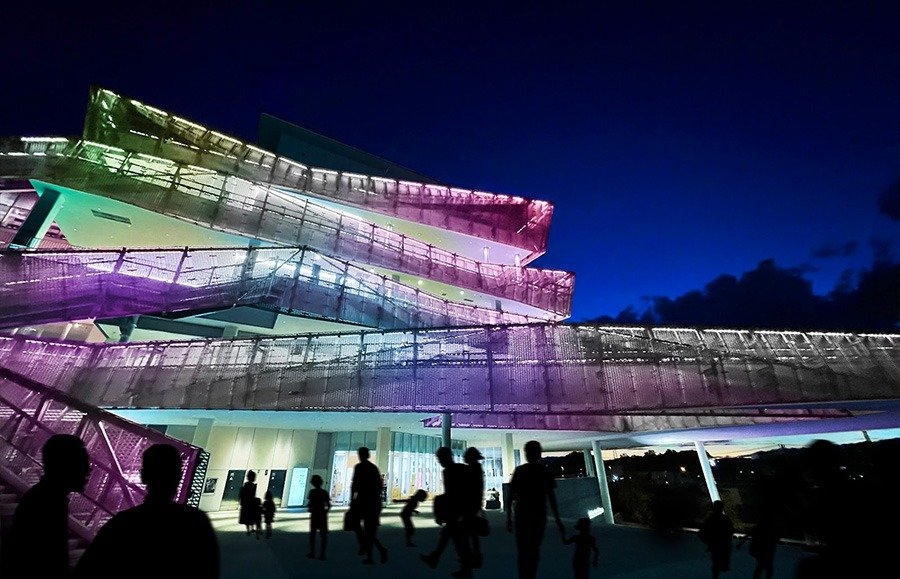 在主建築外面的鐵絲網上掛着七彩的燈飾,如像馬戲團的肥皂泡在天上飛舞一樣,將人們的視線從地面帶往空中。