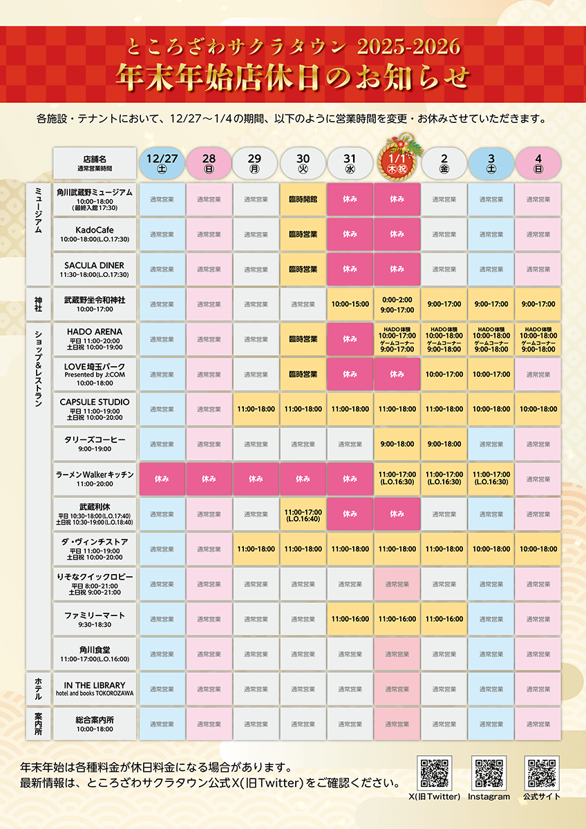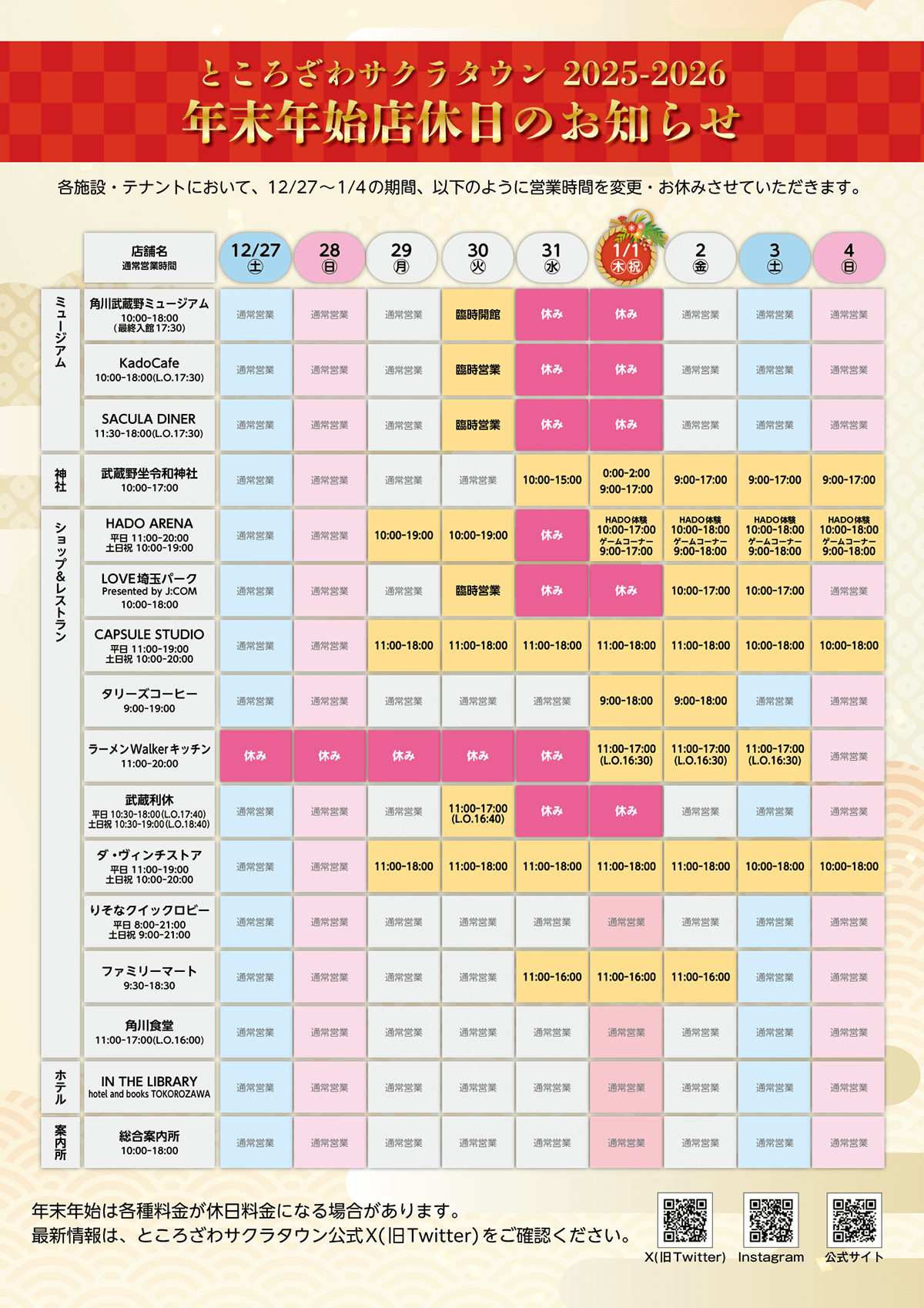 ところざわサクラタウン内の以下の施設では、2025年12月27日(土)~2026年1月4日(日)の期間は、年末年始につき各施設の営業日時が通常と異なる場合がございます。詳細は以下をご確認ください。