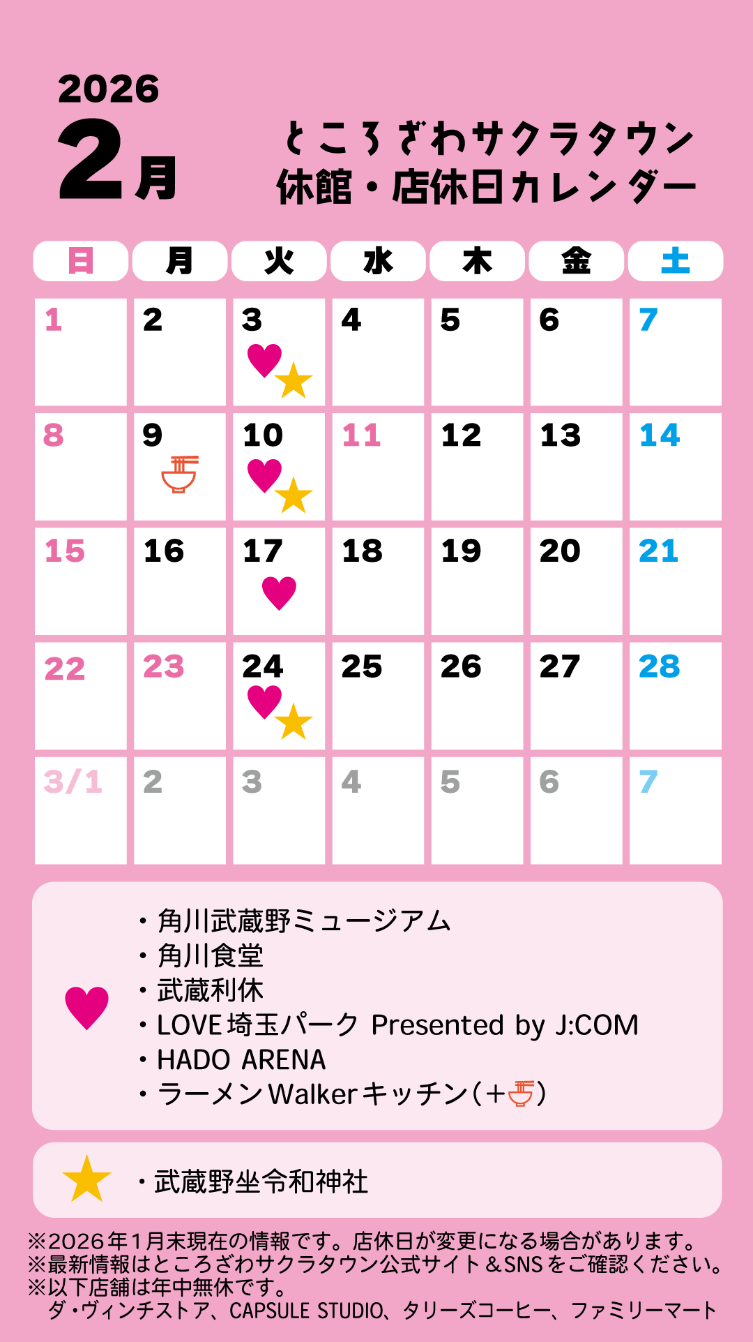 ところざわサクラタウン 2026年2月店休日・営業時間変更のご案内